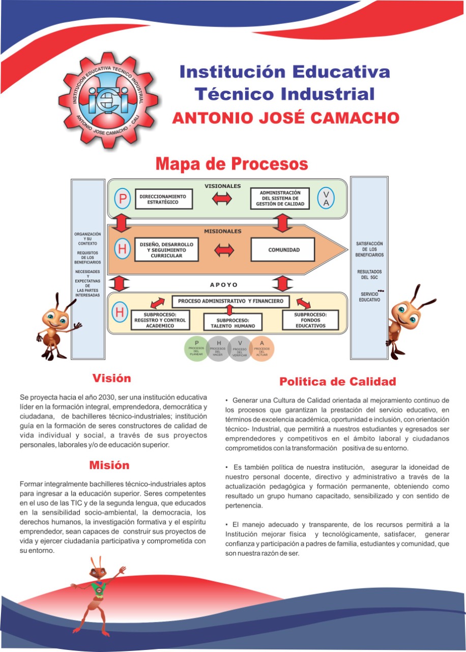 El mapa de procesos es la estructura visual de como la institución está organizada por procesos y como cada uno se articula con el otro. Cada proceso tiene uno o varios lideres que hacen parte del comité de calidad, que apoya al rector para administrar la institución y así lograr los objetivos institucionales.